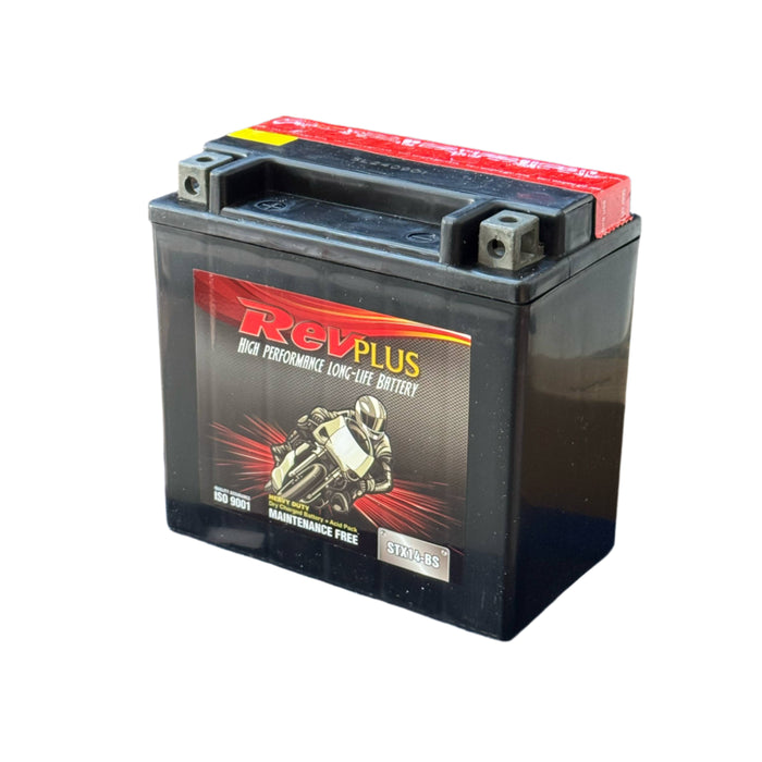 Why Choose RevPlus AGM Battery: The RevPlus STX14-BS motorcycle battery offers maintenance-free convenience with superior power and performance. Its spill-proof and leak-proof design ensures safety and reliability, making it the perfect choice for high-demand applications.